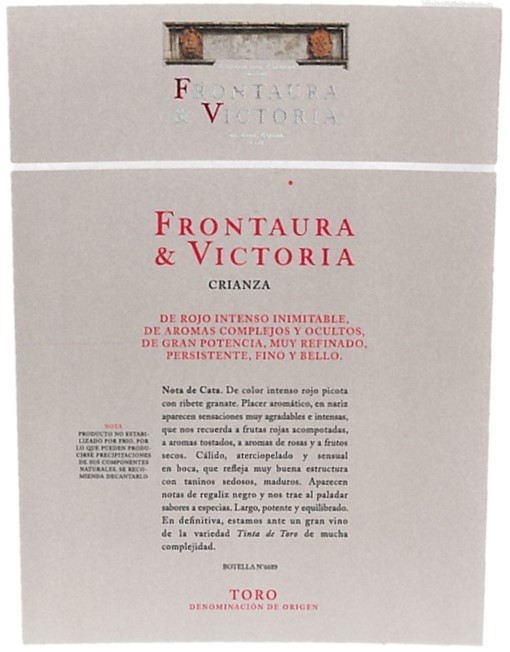 | Charakter | Am Gaumen samtige Tannine. Dieser Crianza bringt die Einzigartigkeit und Kraft der Frontaura-Rotweine in Toro zum Ausdruck: Frische, Volumen, Eleganz und ein unvergesslicher Abgang. |